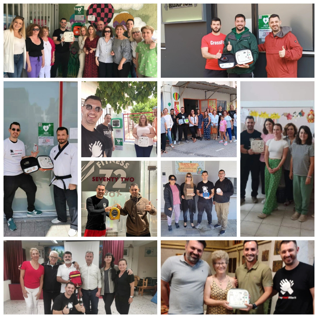 ΕΜΠΡΑΚΤΑ με ΔΩΡΕΕΣ απινιδωτών σε όλη την Ελλάδα, σε σχολεία, σε δομές, σε συλλόγους, σε χωριά, ΔΩΡΕΕΣ αναλωσίμων σε απινιδωτές που είχαν απενεργοποιηθεί, όπως παιδιατρικά ηλεκτρόδια, μπαταρίες, και σε κουτιά φύλαξης τους, αλλά και εκατοντάδες ΔΩΡΕΑΝ πιστοποιήσεις σε όλους τους παραπάνω!! Ενέπνευσε ιδιωτικές πρωτοβουλίες αγοράς απινιδωτών, σε εταιρίες, γυμναστήρια, καταστήματα,φαρμακεία, σχολεία κ.α